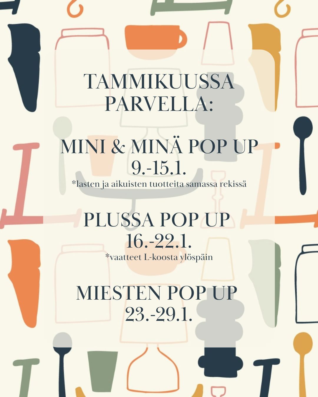 Mini & Minä Pop-Up 9.-15.1. | PLUSSA Pop-Up 16.-22.1. | Miestenvaate Pop-Up 23.-29.1.